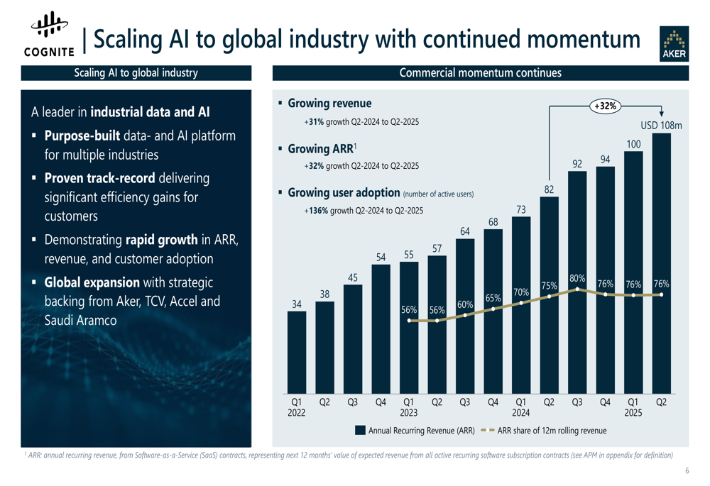 A Aker também está se posicionando fortemente no espaço de IA industrial através da Cognite, que demonstrou um crescimento impressionante com um aumento de 32% na Receita Recorrente Anual (ARR) e crescimento de 136% na adoção de usuários do 2º tri de 2024 ao 2º tri de 2025.