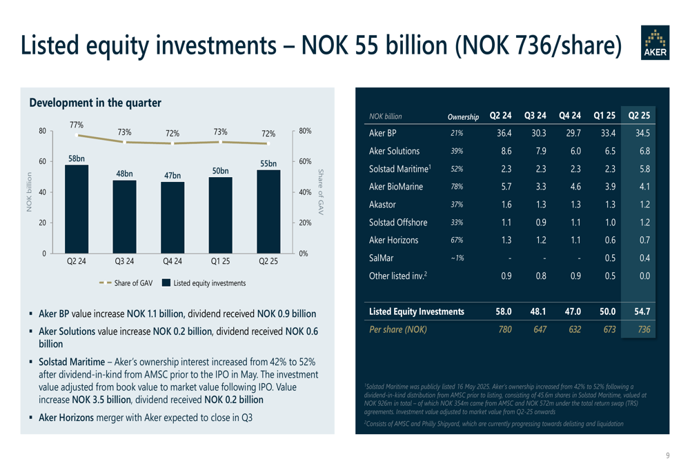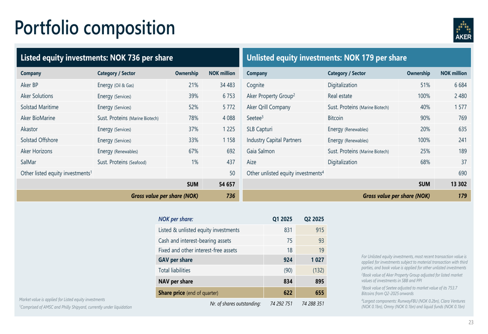 Os investimentos em ações listadas da Aker, avaliados em NOK 55 bilhões, representam 72% do total de ativos da empresa. O portfólio é dominado pela Aker BP (NOK 34,5 bilhões), seguida pela Aker Solutions (NOK 6,8 bilhões) e Solstad Maritime (NOK 5,8 bilhões).