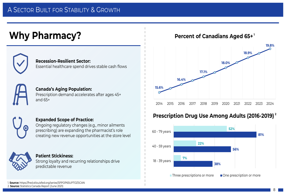 A PharmaCorp opera no que descreve como "um setor estável, resiliente e em crescimento", beneficiando-se de gastos essenciais com saúde que geram fluxos de caixa consistentes. O setor farmacêutico canadense é altamente fragmentado, com modelos de propriedade que variam de redes corporativas a operadores independentes, criando oportunidades para consolidação.
