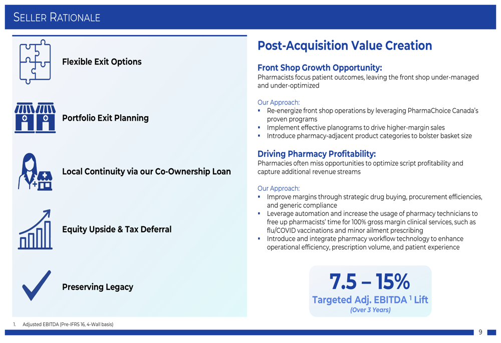 A estratégia de criação de valor pós-aquisição da PharmaCorp concentra-se em oportunidades de crescimento da área frontal da loja e no aumento da lucratividade da farmácia. A empresa visa melhorias no EBITDA ajustado de 7,5-15% ao longo de três anos para locais adquiridos.