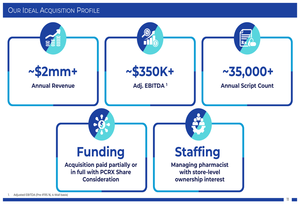 A PharmaCorp estabeleceu um perfil claro para suas aquisições-alvo, focando em farmácias com aproximadamente US$ 2 milhões em receita anual, mais de US$ 350.000 em EBITDA ajustado e mais de 35.000 prescrições anuais. A empresa tipicamente estrutura negócios para incluir pagamento parcial ou total com ações PCRX e enfatiza a retenção de farmacêuticos gestores com participações acionárias no nível das lojas.