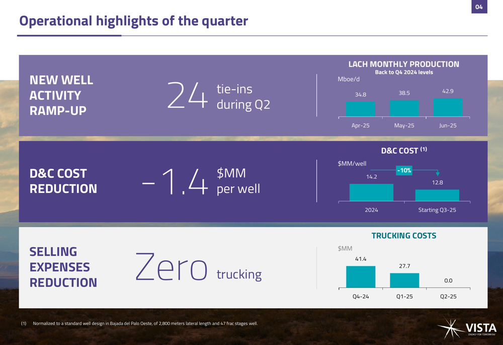 O trimestre foi marcado por melhorias operacionais significativas que contribuíram para o forte desempenho da Vista. A empresa conectou 24 novos poços durante o 2º tri e alcançou uma redução de US$ 1,4 milhão nos custos de perfuração e completação (D&C) por poço, representando uma melhoria de 10%.