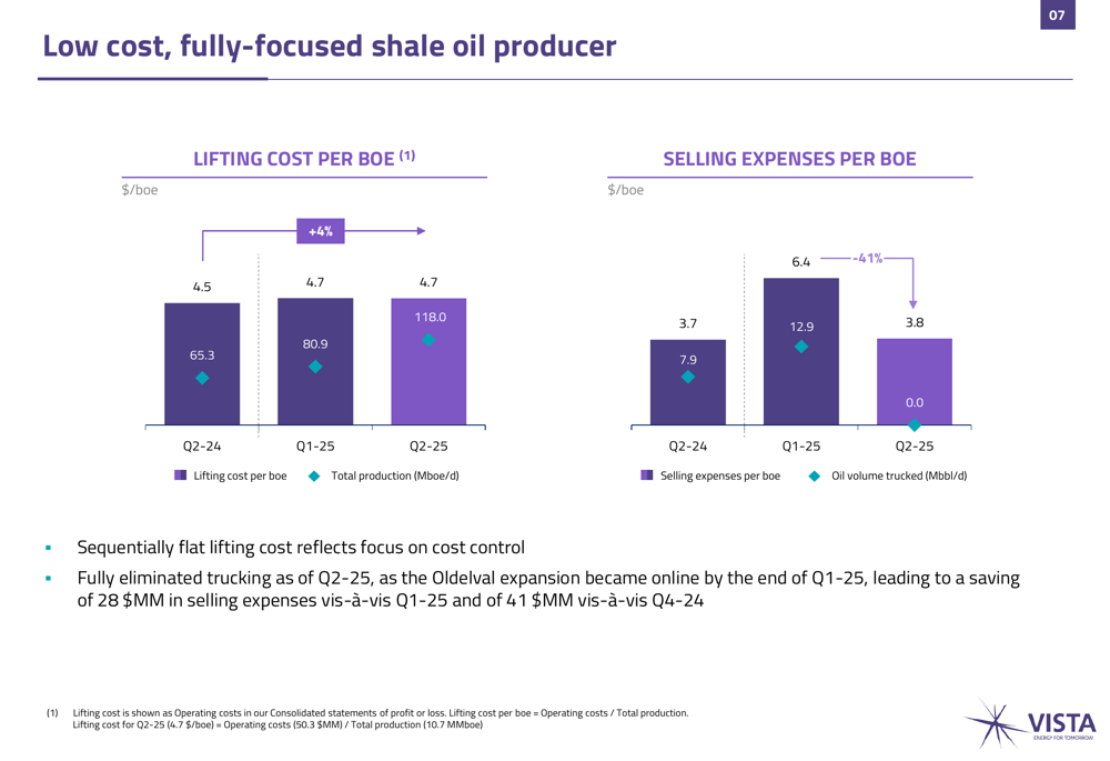 Um marco operacional importante foi a eliminação completa dos custos de transporte por caminhão, com a expansão do oleoduto Oldelval entrando em operação no final do 1º tri de 2025. Esta melhoria operacional levou a economias de US$ 28 milhões em comparação com o 1º tri de 2025 e US$ 41 milhões em comparação com o 4º trimestre de 2024.