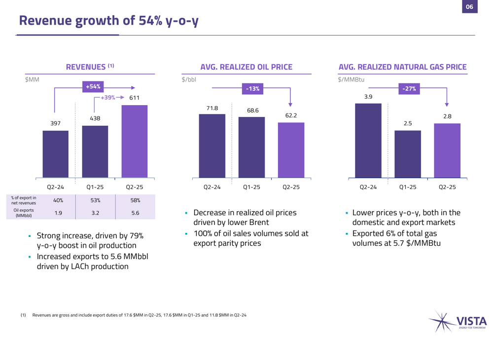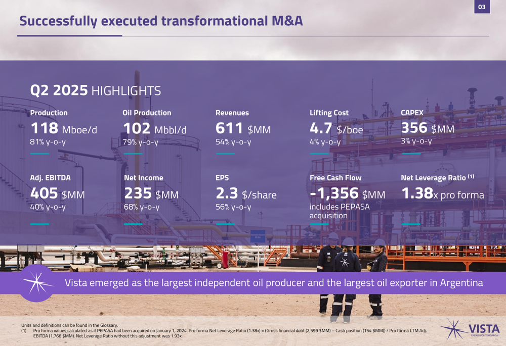 Os resultados do 2º tri de 2025 da Vista refletem sua execução bem-sucedida de uma estratégia de crescimento transformacional. A aquisição da PEPASA e a consolidação de 50% de participação em La Amarga Chica expandiram significativamente a base de produção e as capacidades de exportação da empresa.