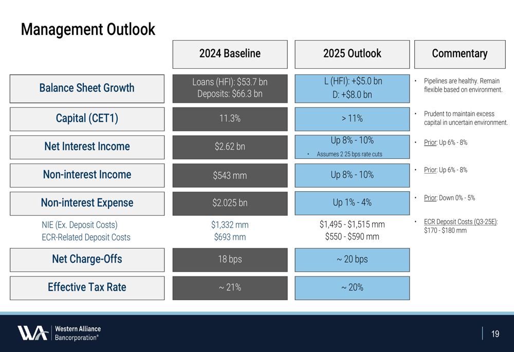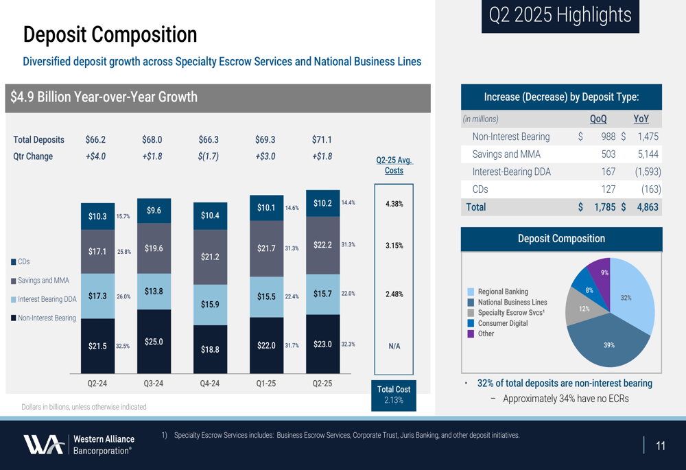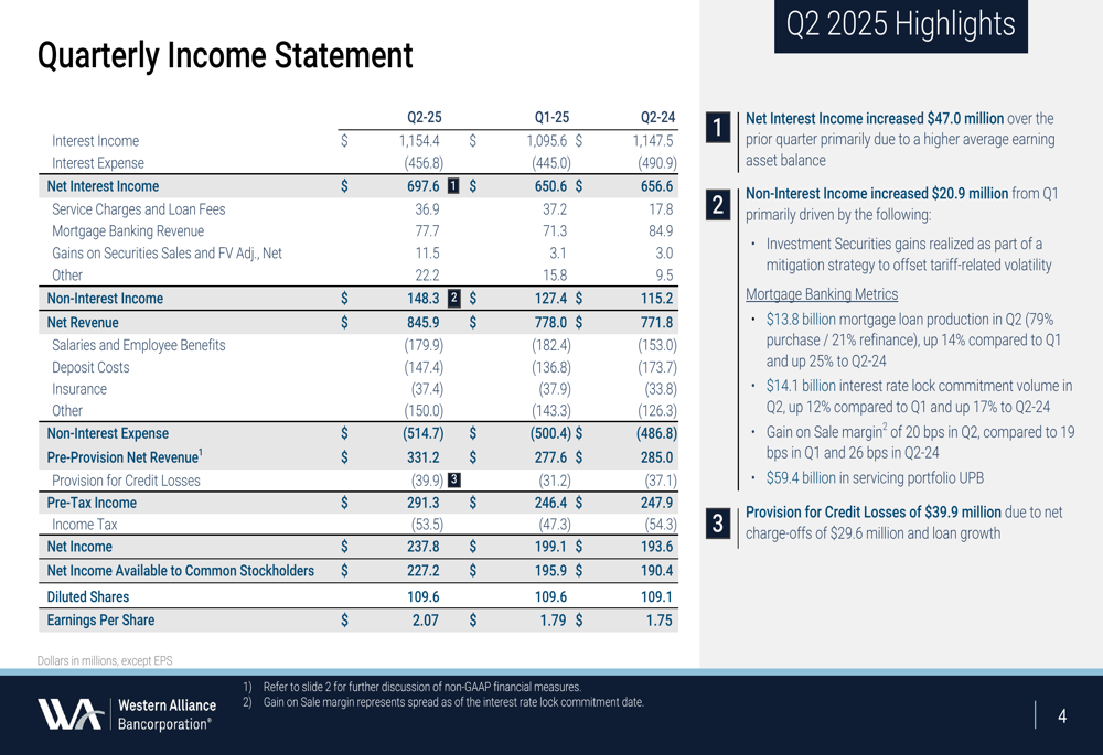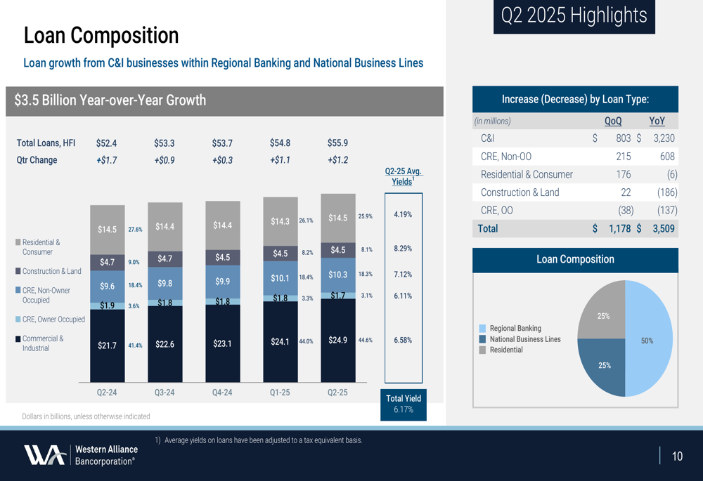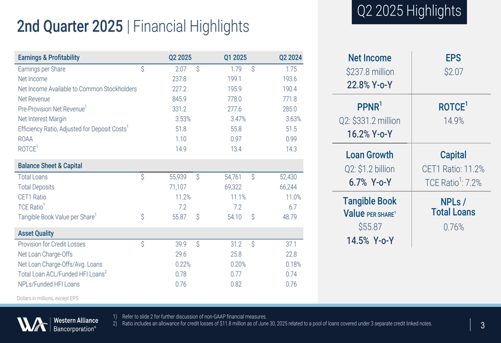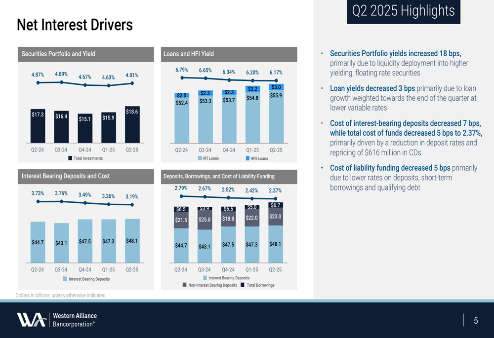 A Western Alliance Bancorporation (NYSE:WAL) apresentou resultados financeiros sólidos no segundo trimestre de 2025, de acordo com a apresentação de resultados da empresa realizada em 18.07.2025. O banco reportou crescimento significativo ano a ano em métricas-chave, enquanto continua a ganhar impulso para ultrapassar o limite de US$ 100 bilhões para Grandes Instituições Financeiras.
