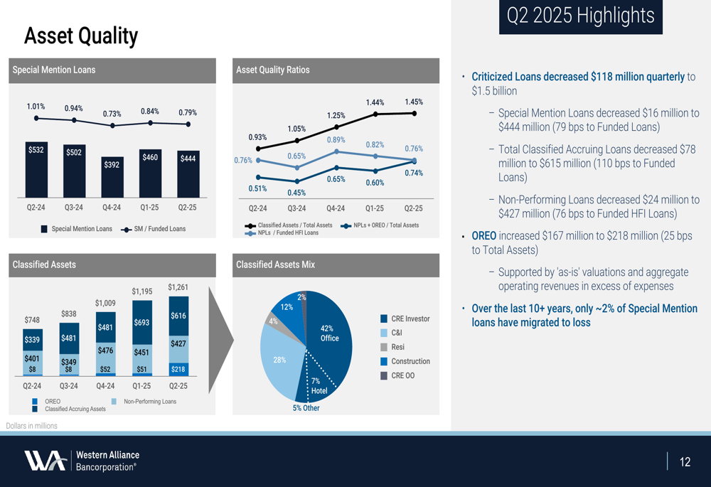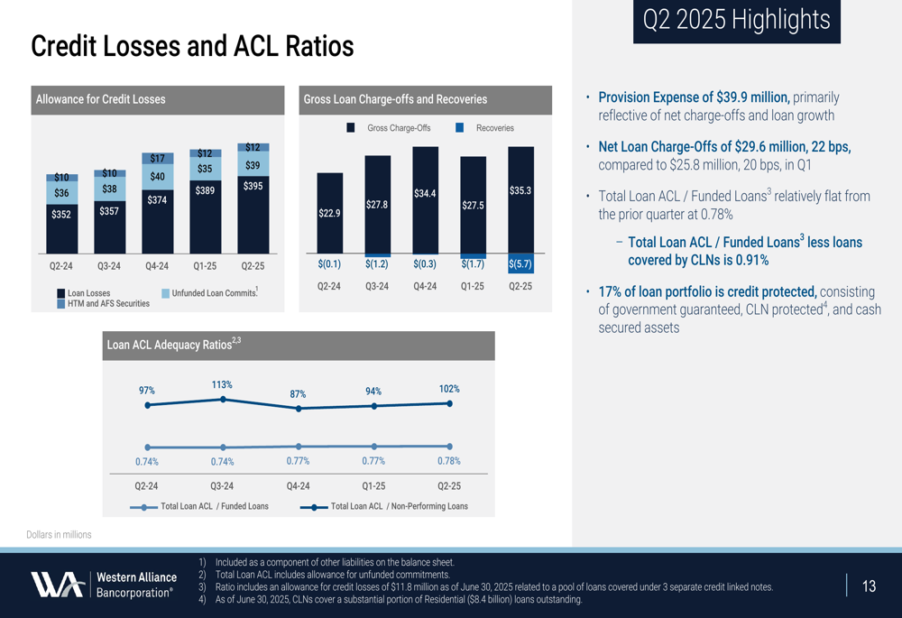 A Western Alliance manteve métricas sólidas de qualidade de ativos no 2º tri 2025. A provisão para perdas de crédito foi de US$ 39,9 milhões, refletindo principalmente baixas líquidas de US$ 29,6 milhões (0,22% dos empréstimos médios) e crescimento de empréstimos durante o trimestre.