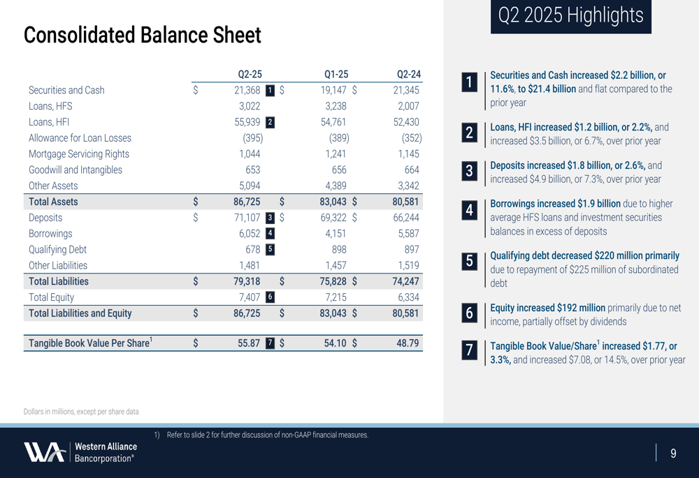 A Western Alliance continuou a expandir seu balanço no 2º tri 2025, com ativos totais atingindo US$ 86,7 bilhões. Os empréstimos mantidos para investimento aumentaram US$ 1,2 bilhão para US$ 55,9 bilhões, representando um crescimento de 6,7% ano a ano. Os depósitos totais cresceram US$ 1,8 bilhão para US$ 71,1 bilhões.