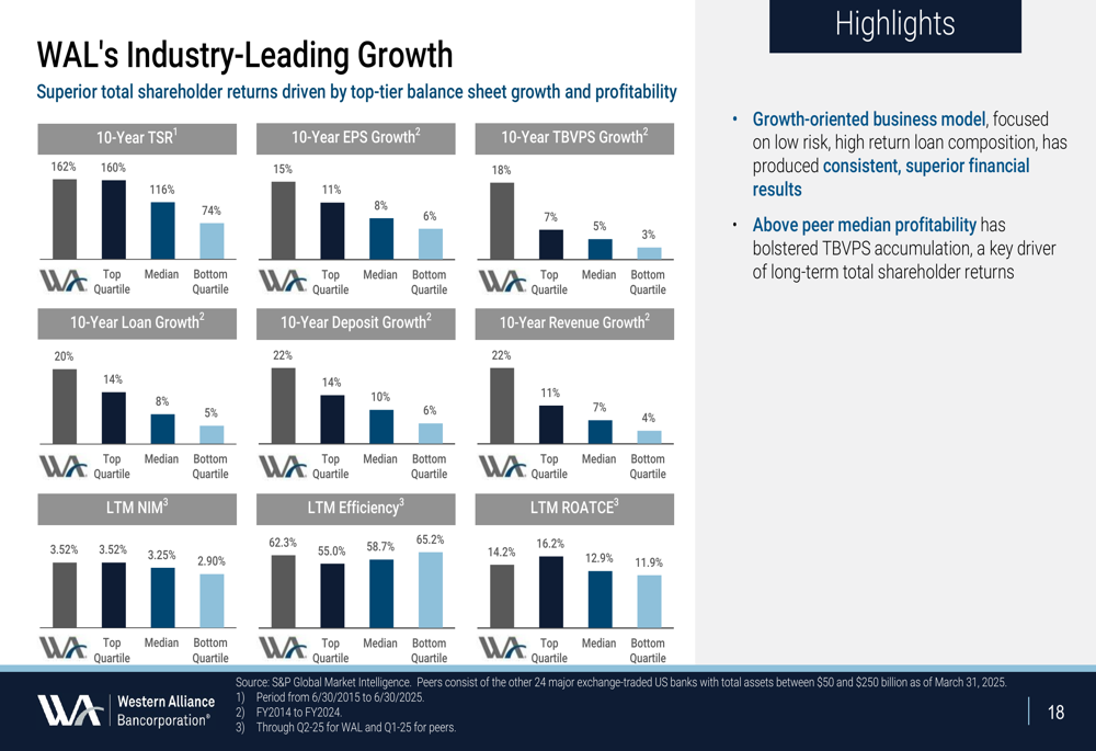 As métricas de crescimento líderes do setor da Western Alliance a posicionam favoravelmente em comparação com seus pares em múltiplos indicadores de desempenho financeiro: