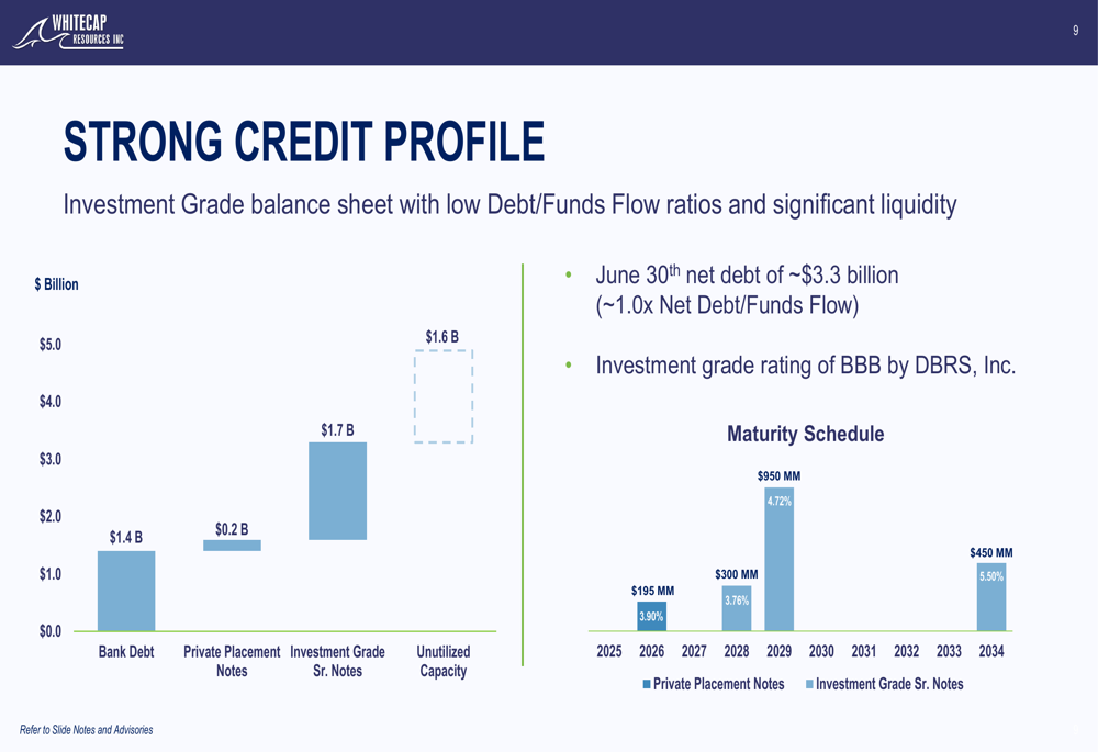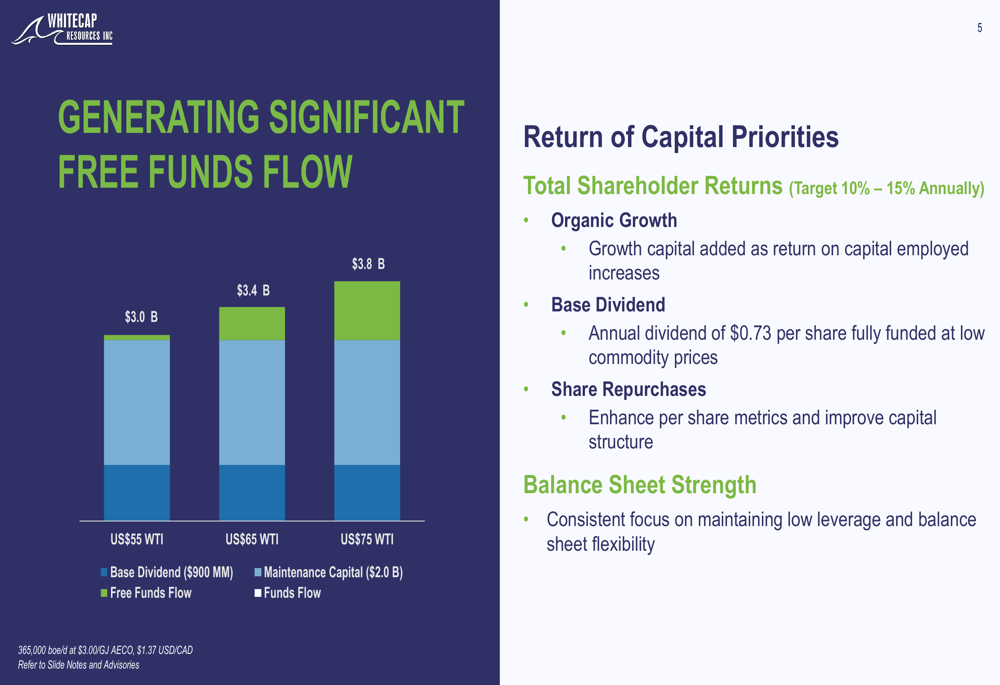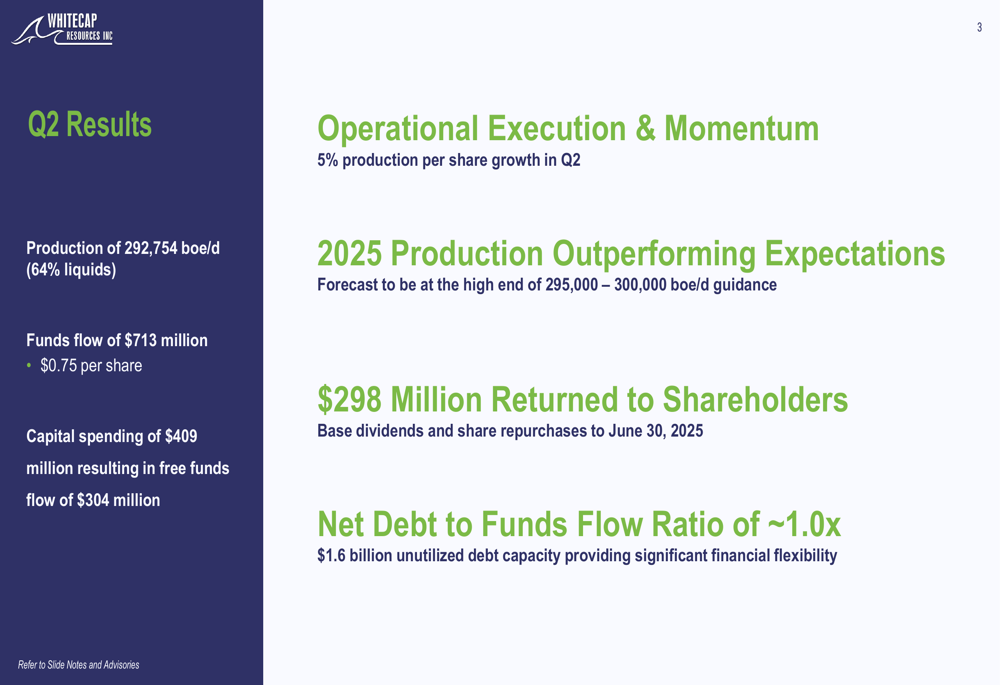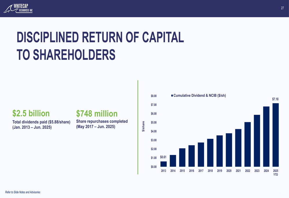 A administração continua focada em melhorar as eficiências de capital e expandir margens, visando mais de US$ 200 milhões em economias anuais através de sinergias corporativas, melhorias na eficiência de capital e reduções nos custos operacionais. Estas iniciativas, combinadas com a escala e expertise operacional da Whitecap, posicionam a empresa para entregar fortes retornos aos acionistas em todos os ciclos de preços de commodities.