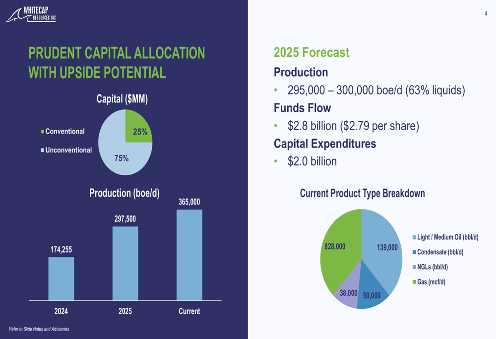 Olhando para o futuro, a Whitecap forneceu orientação para 2025 visando produção de 295.000-300.000 boe/d (63% líquidos), com despesas de capital de US$ 2,0 bilhões. A empresa espera gerar fluxo de fundos de US$ 2,8 bilhões (US$ 2,79 por ação) com base nas atuais premissas de preços de commodities.