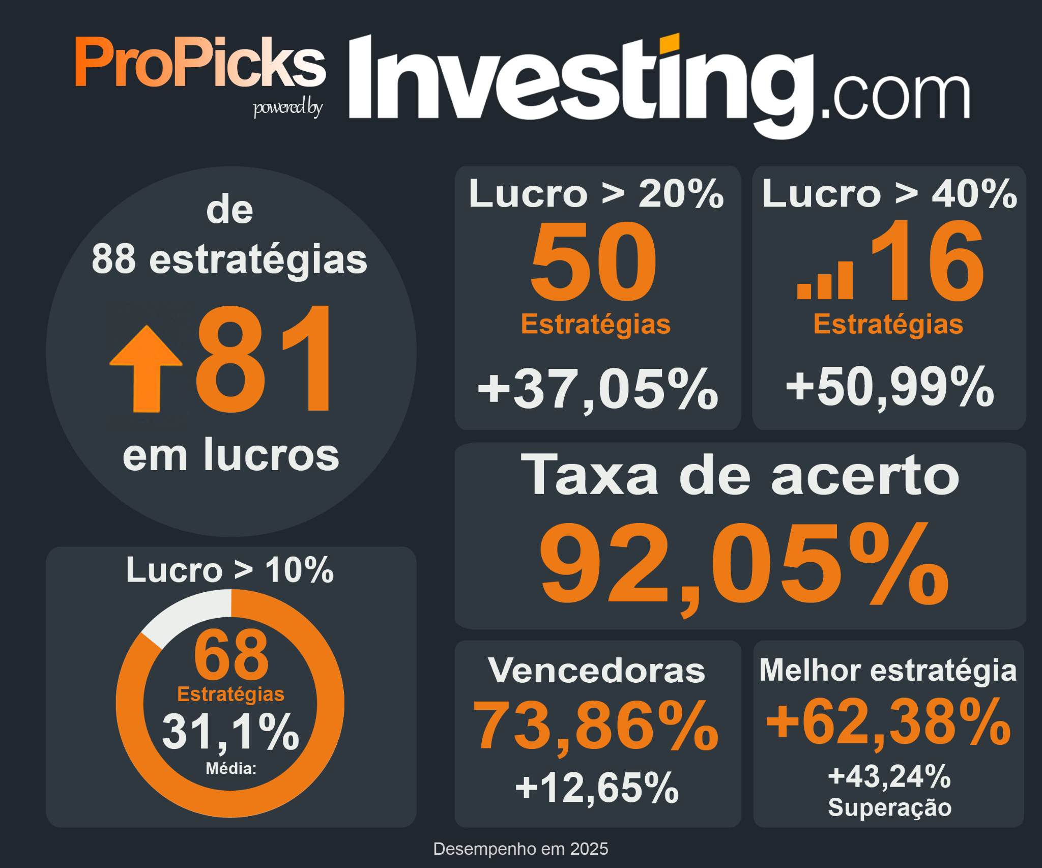 - 68 estratégias vencedoras registraram ganho médio de 31,1%