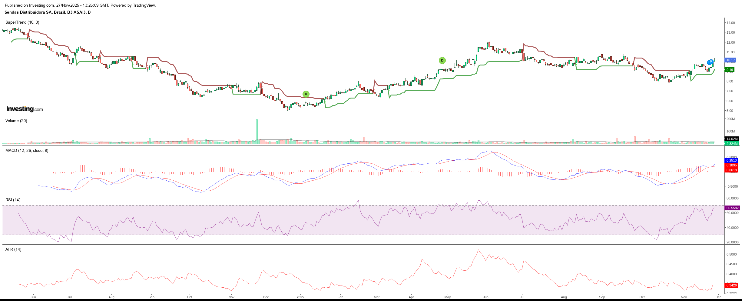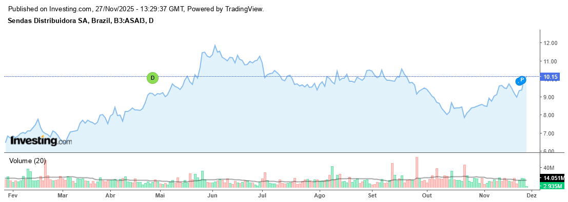Investing.com - A ação do Assaí (ASAI3) fechou em forte alta de 6,38% nesta quarta-feira (27), com o preço de fechamento em R$ 10,00. O movimento foi seguido hoje pela divulgação de um Fato Relevante que adiciona uma camada de otimismo fundamentalista: os fundos Snapper Rocks e WHG Apache, ligados aos irmãos Ederson e Everton Muffato, montaram uma posição acionária de cerca de 10% na rede de atacarejo, combinando compra direta de ações e operações de swap (TRS) com BTG Pactual e XP.