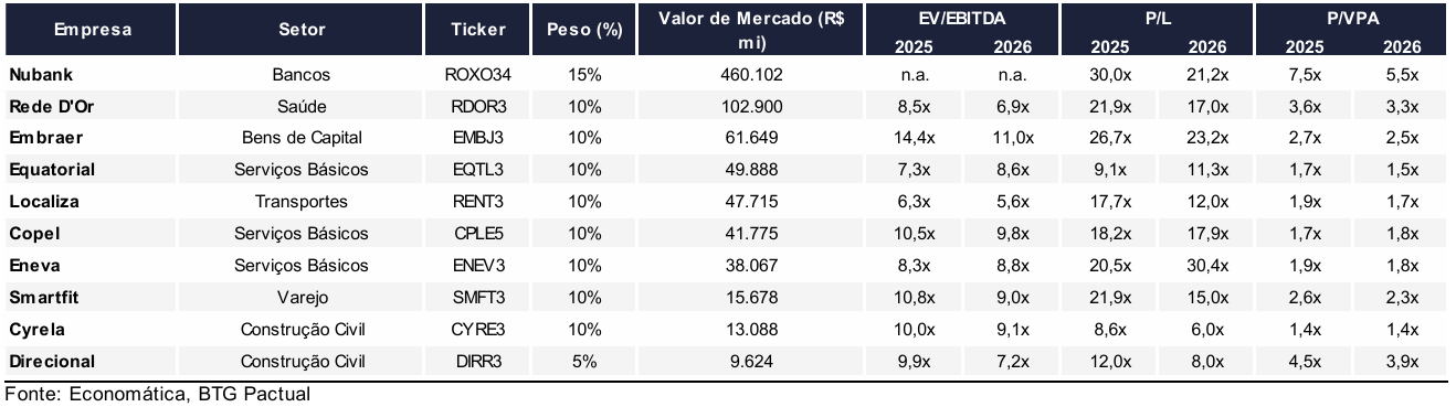 Para abrir espaço à nova posição, o banco optou por retirar o Itaú Unibanco (BVMF:ITUB3), que integrava a carteira havia bastante tempo e acumulou forte valorização no ano. A fim de evitar uma redução excessiva na exposição ao setor financeiro, o BTG aumentou a participação do Nubank (BVMF:ROXO34) de 10% para 15%.