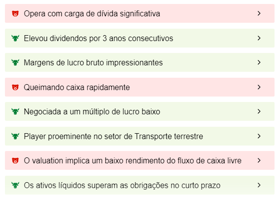 O InvestingPro traz ainda alguns insights sobre indicadores fundamentalistas da companhia desenvolvidos por meio de inteligência artificial (IA). As Protips, como são chamadas, indicam que a Vamos elevou dividendos por três anos seguidos e possui margens de lucro bruto impressionantes, mas opera com carga de dívida significativa. Estes insights são avaliados como bullish, indicados por um touro, em verde, e bearish, em vermelho, apontando ressalvas sobre o papel.
