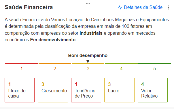Além do preço-justo, outros indicadores sobre a Vamos podem ser encontrados no InvestingPro. A saúde financeira da companhia é avaliada com bom desempenho, com nota três, de métrica que vai de um a cinco.