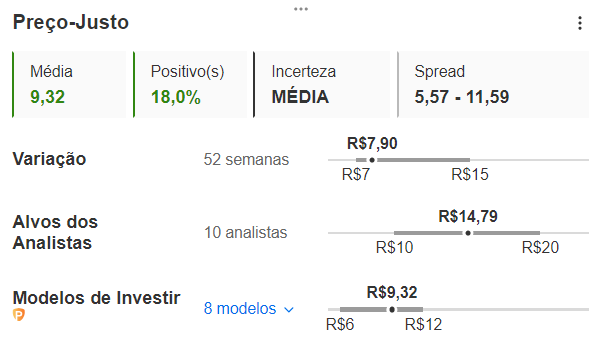 O preço-justo avaliado pelo InvestingPro para as ações da Vamos é de R$9,32, com grau de incerteza médio, de acordo com oito modelos de investimentos. O alvo de dez analistas é ainda mais otimista, em R$14,79.