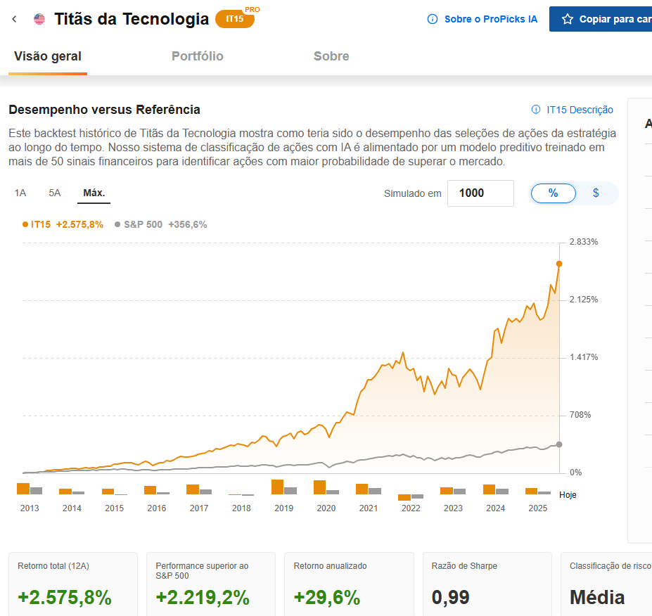O histórico comprova: seguir a estratégia no longo prazo gera resultados consistentes. Um exemplo é a carteira dos Titãs da Tecnologia, que superou o S&P 500 em 12 anos.Como exemplo, um investimento inicial de US$ 100 mil poderia ter se transformado em US$ 2,42 milhões.