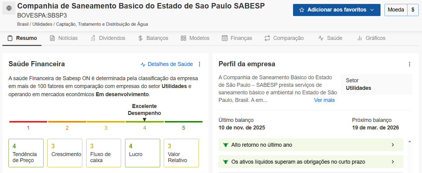De acordo com o InvestingPro, plataforma premium do Investing.com que fornece dados e análises de nível institucional com uso de inteligência artificial, a saúde financeira da Sabesp é considerada “excelente”, o que justifica o alto retorno entregue pela ação no último ano.