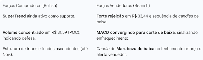 O cenário imediato é de neutralidade. Qualquer fechamento diário fora do intervalo R$ 30,90–R$ 32,25 é o sinal claro para o investidor agir.