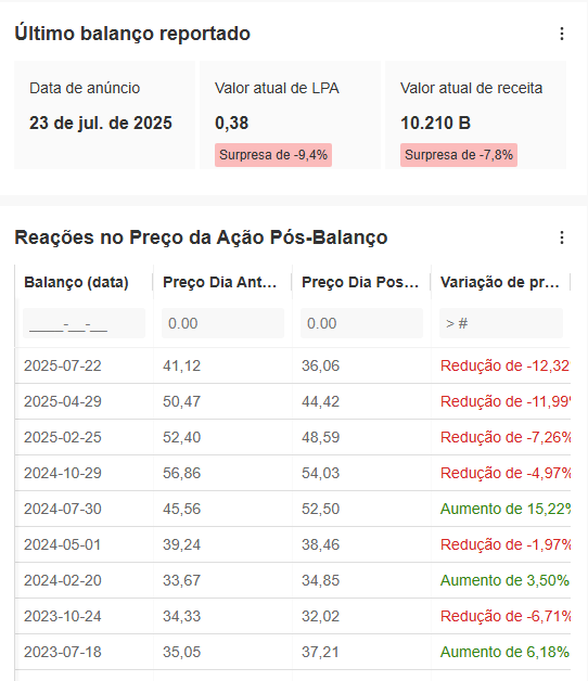 Para quem opera comprado em cima de balanço, a Weg tem decepcionado nas últimas temporadas de balanço. O InvestingPro apresenta que, após os últimos quatro balanços, as ações da Weg tiveram forte queda devido a resultado abaixo do esperado pelo mercado.